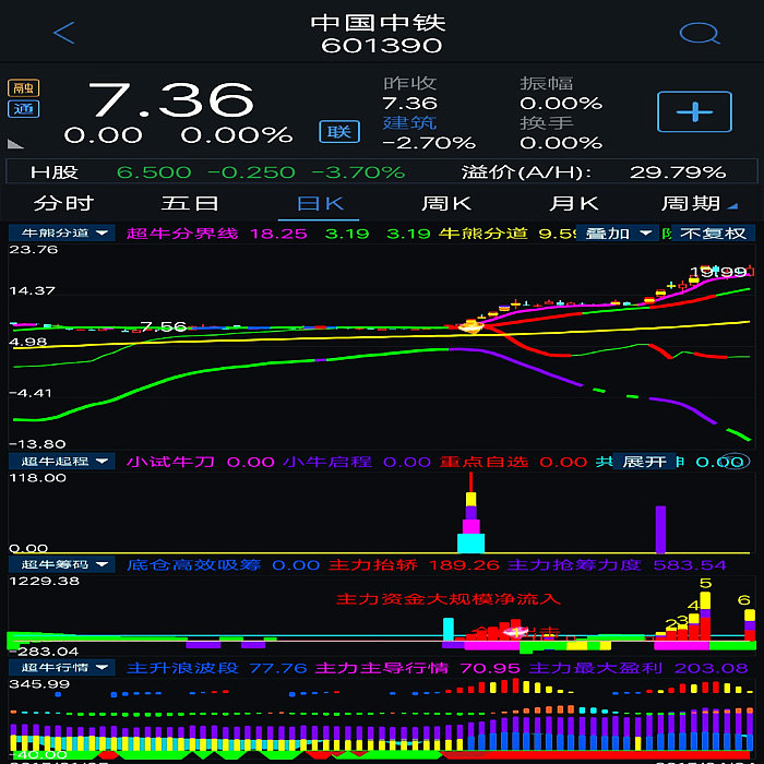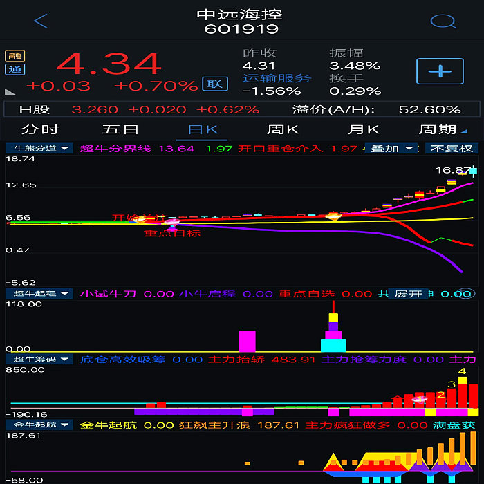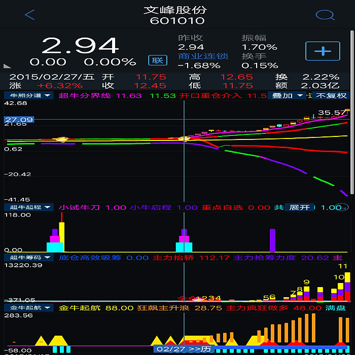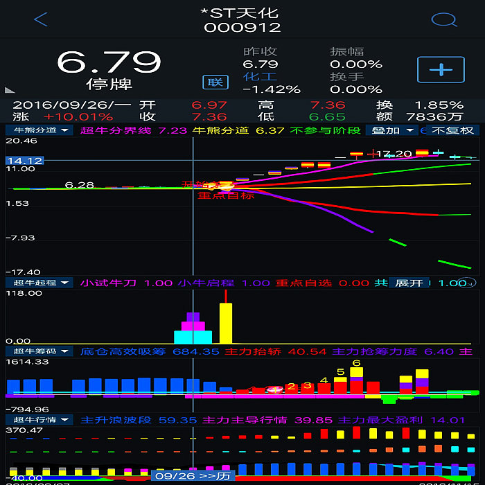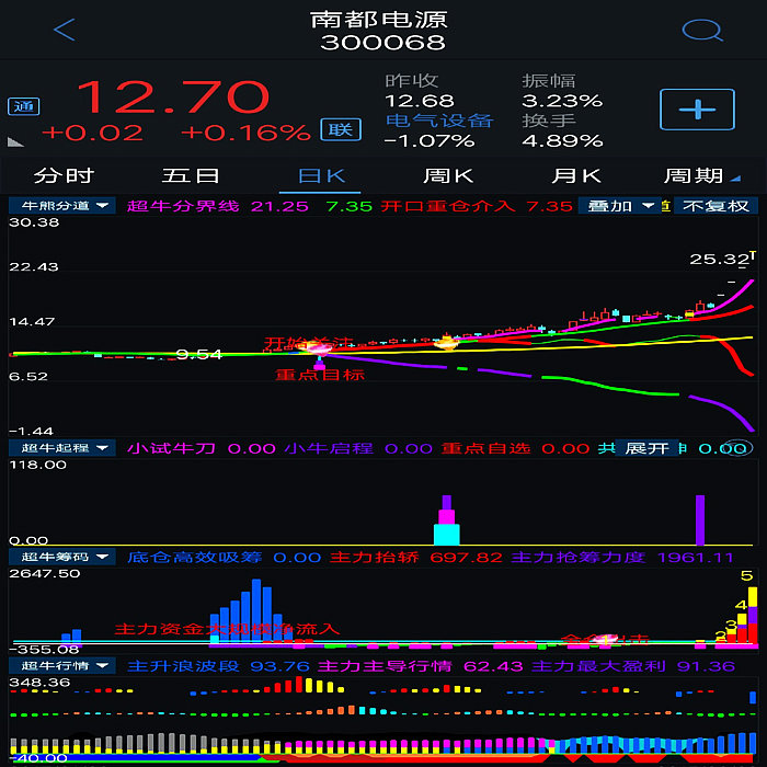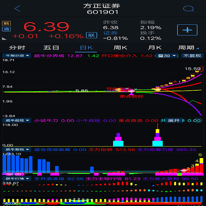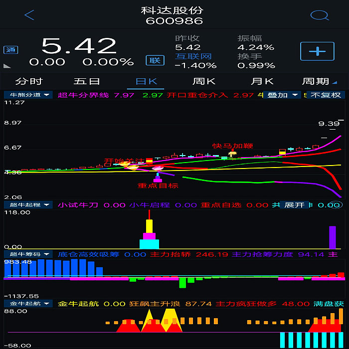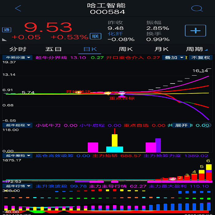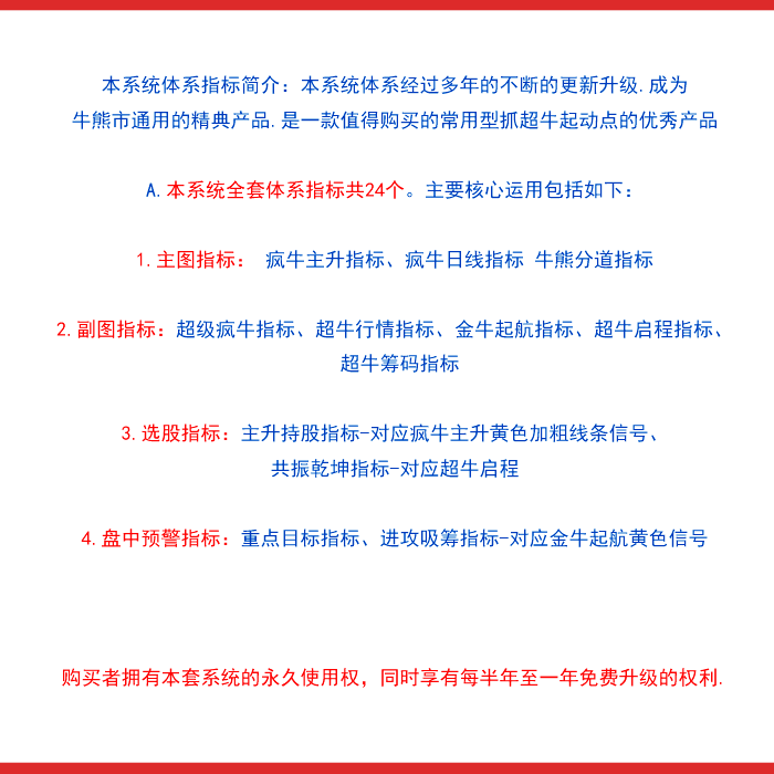 基本构架已形成。对超牛个股:主力底仓高效收集筹码,主力抬轿推升股价,提示主力筹码吸筹力度,拉升派发筹码,滯涨派发(超牛行情结束)等进行全程监控。当个股出现主力抬轿和主力筹码吸筹力度同时超过100数值即表示该股处于超强状态,配合本指标体系综合判断,更加精准。本指标体系综合判断超牛个股更加牛。 5、超牛启程:设置有小试牛刀、超牛启程和共振乾坤三个信号,当小试牛刀、超牛启程两个信号在短时间内同时出现时,将形成共振(显示“共振乾坤”信号),产生超牛强势爆发力!!出现共振信号重仓或全仓介入。其已经将指标体系最重要的选股指标进攻吸筹、超级疯牛指标中的震仓信号、超牛横盘突破信号、阻击疯牛信号全部优化于一体。综合判断超牛狂飙主升起飞时刻,提示客户及时介入超牛个股,功能十二分强大。核心选股指标及副图指标之一。