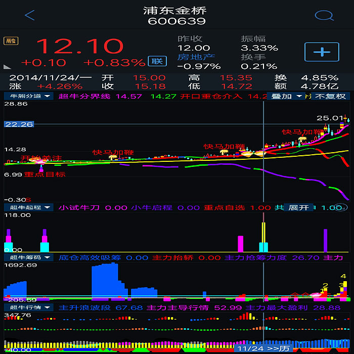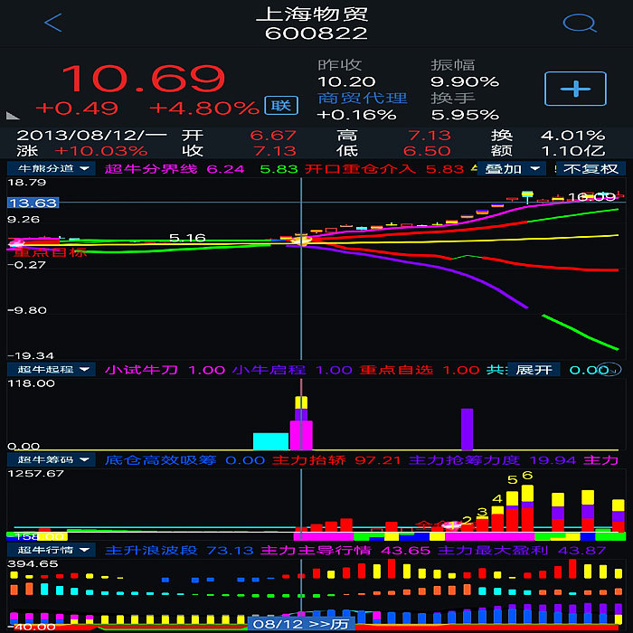 1、超级疯牛:显示主力资金在个股不同行情阶段获利盘占流通盘比例情况及其是否进入潜力股,主力资金对个股运作震仓结束、横盘整理突破等相关提示。 2、超牛行情:显示股价所处涨跌阶段及提示客户持有或卖出,比如当个股显示横向红色信号时即为持股波段,当个股显示竖向蓝色立柱表示该股处于主升浪波段(详见第一个配图:指标使用说明)