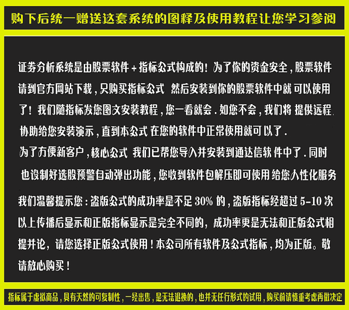 即使你有绝世武功,也需要有一款合适自己的正版神兵利器来助您成为股市赢家! 我们温馨提示您:盗版公式的成功率是不足30%的,更是无法和正版公式相提并论,请您选择正版公式使用!本公司所有软件及公式指标模型,均为正版, 假一罚十。敬请放心购买!
