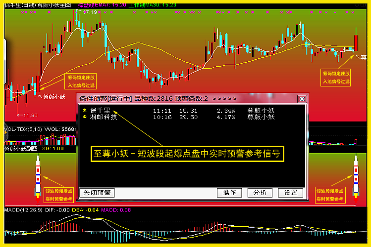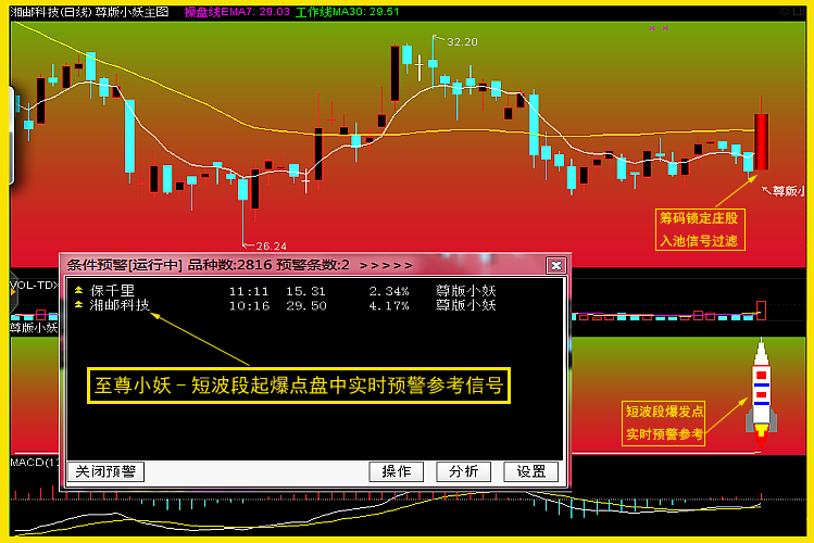 至尊小妖短波段起爆点实战系统过滤入池或盘中实时预警参考的信号股较少,大盘不好时候不出票,系统出的信号票是帮你缩短选股时间和范围,让你避免无从选择的茫然和天天选股的忐忑。如想一买就赚的朋友请不要拍购.