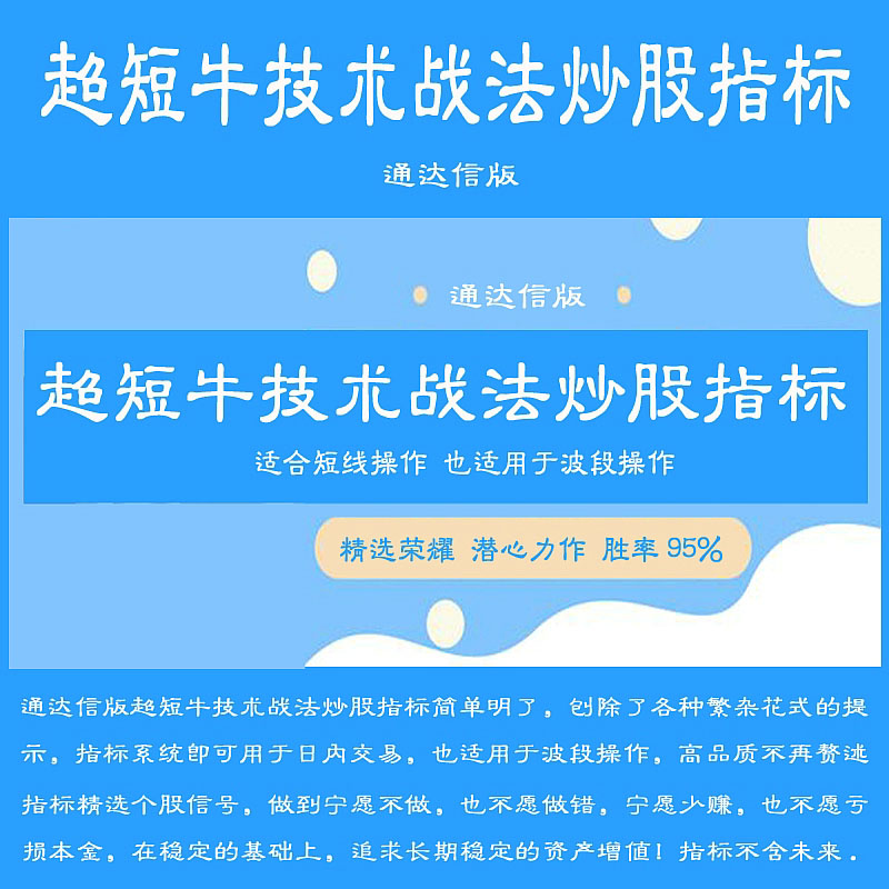 通达信版超短牛技术战法炒股指标 精选荣耀 潜心力作 胜率95% 把握盘中低吸介入 隔天冲高获利即出 适合短线操作 也适用于波段操作通达信版超短牛技术战法炒股指标包括副图、选股公式。指标出信号提示后,可以当天介入,请谨慎下单! 指标使用方便,简单易懂,一学就上手。一旦拥有,终身受益。通达信版超短牛技术战法炒股指标把握盘中低吸介入,隔天冲高获利即出,适合短线操作通达信版超短牛技术战法炒股指标简单明了,刨除了各种繁杂花式的提示,指标系统即可用于日内交易,也适用于波段操作,高品质不再赘述;使用本指标无需手忙脚乱的盲目追涨杀跌,轻松操作,这是一个量化交易模型,也就是技术规律模式,让你真正把握抄底逃顶的绝对优势!指标精选个股信号,做到宁愿不做,也不愿做错,宁愿少赚,也不愿亏损本金,在稳定的基础上,追求长期稳定的资产增值!及时把握盘面机会和规避风险,抓住确定性做多机会 捕捉牛股起爆点首先您需要先了解指标的信号位置,是否适合您的操作习惯和持股盈亏的心理预期;我们需要根据指标建立一个交易模型;建立交易模型是为了更好的买入卖出操作;一般来说根据不同的指标出信号的位置是不一样的;这个时候我们需要根据自己的操作思维、习惯、心理预期做出不同的判断;判断如下: 一、出信号的票是否当前热门题材; 二、出信号位置是否在自己的心理预期位置; 三、当前行情总体走势是否值得操作;建议出信号后,尽量配合当前当天的热点题材,另外要注意个股是否有黑天鹅或者利空消息;当经过我们的判断后,就可以根据自己的资金仓位进行操作;一般来说短线操作建议分仓进行;对于资金多的来说,仓位尽量控制在三成仓以下;资金少的建议适度谨慎后重仓一些;短线操作:指标出信号后介入时机,建议根据当前日内行情走向,分时线逢低介入,或者下午2点半以后做操作决策;如果当天行情较弱或者受利空影响比较大,建议先观望,隔天择机介入;当天行情走势比较平稳或者较强,建议逢低介入;短线卖出时机,隔天获利即走;短线操作要的是不断的成功复利,而不是一只票的翻倍;别因为贪图小利,导致本来赚钱的票,结果亏损割肉出局这样就不好了;记住股市永远不缺机会,缺的是耐心和信心。温馨提示 本指标的成功率虽然极高,但不等于100%成功,且成功率是基于历史数据统计,本指标为投资辅助参考工具,其预警及选股产生的信号仅供决策参考并不能代表未来,不构成真实股票操作依据,指标的主要目的,是辅助投资者学会自主判断,提高交易胜率。投资者应自主做出投资决策,并独立承担投资风险!