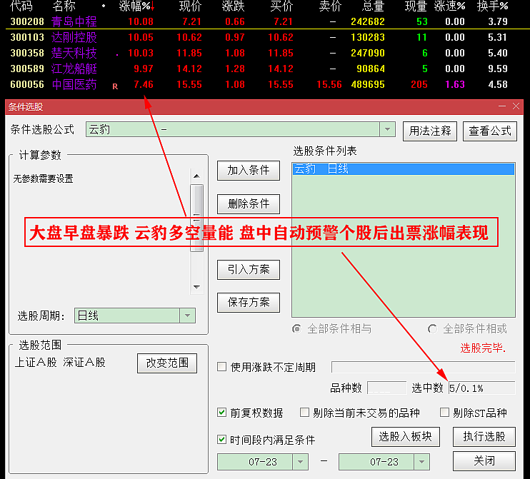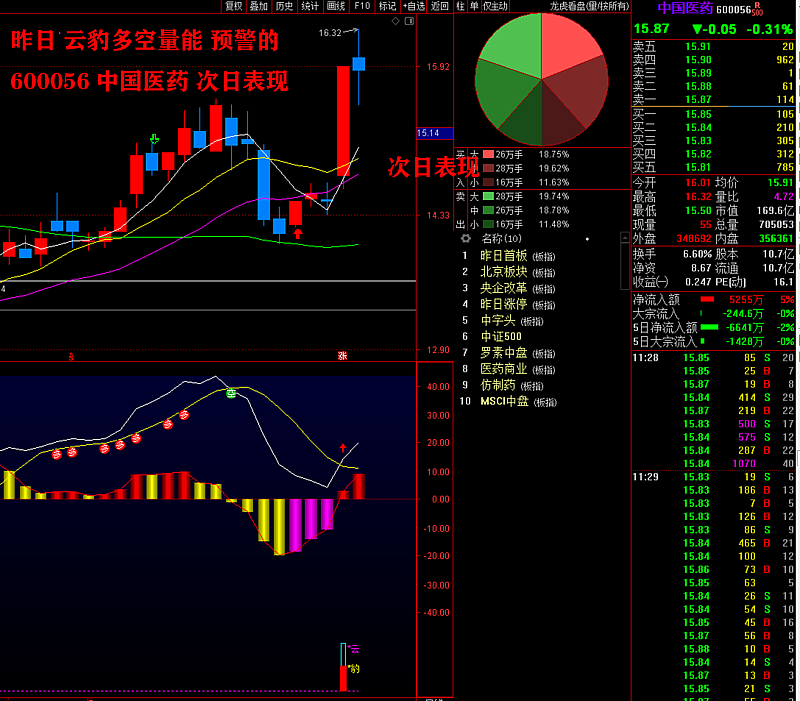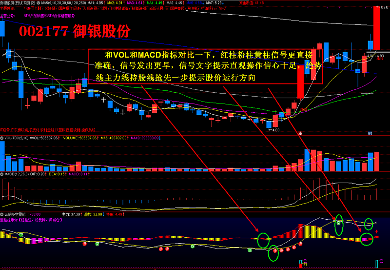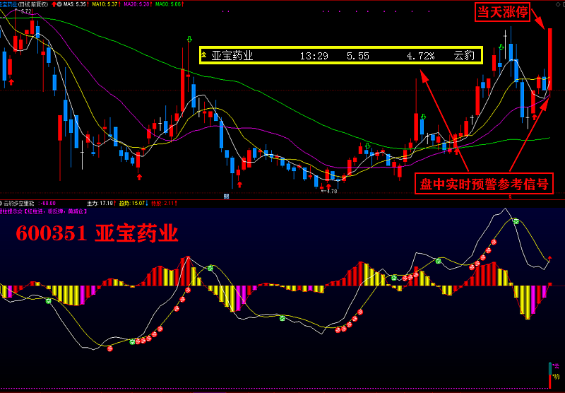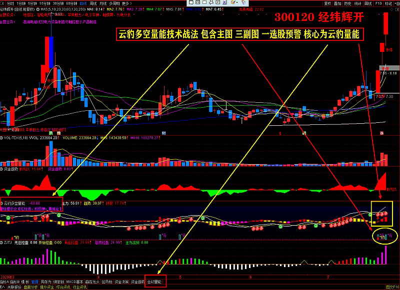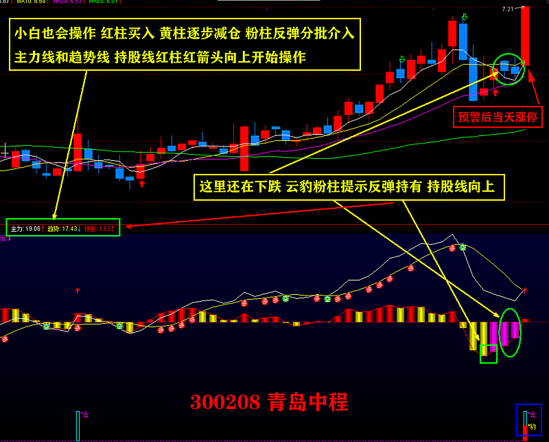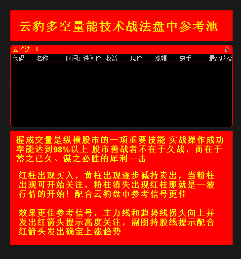 云豹多空量能系统操作简单易掌握,红柱出现买入,黄柱出现逐步减持卖出,当粉柱出现可开始关注,粉柱消失出现红柱那就是一波行情的开始!配合云豹信号盘中提示.