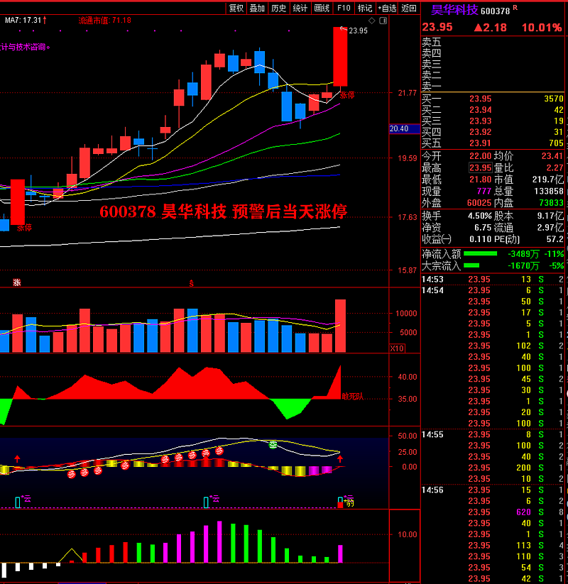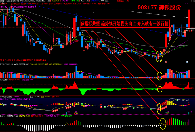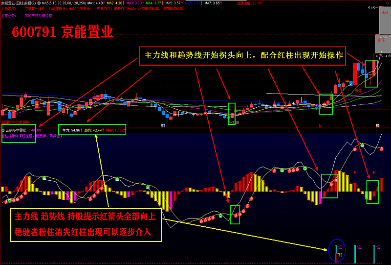 信号效果更佳,主力线和趋势线拐头向上并发出红箭头提示高度关注,副图持股线提示配合红箭头发出确定上涨趋势。