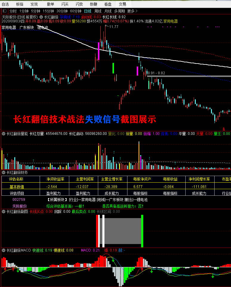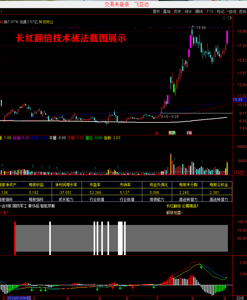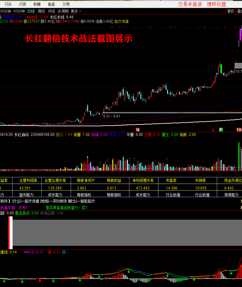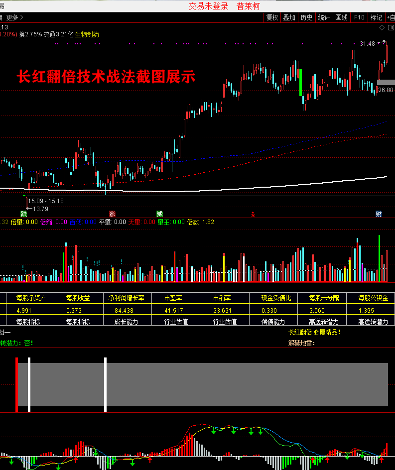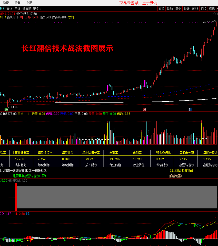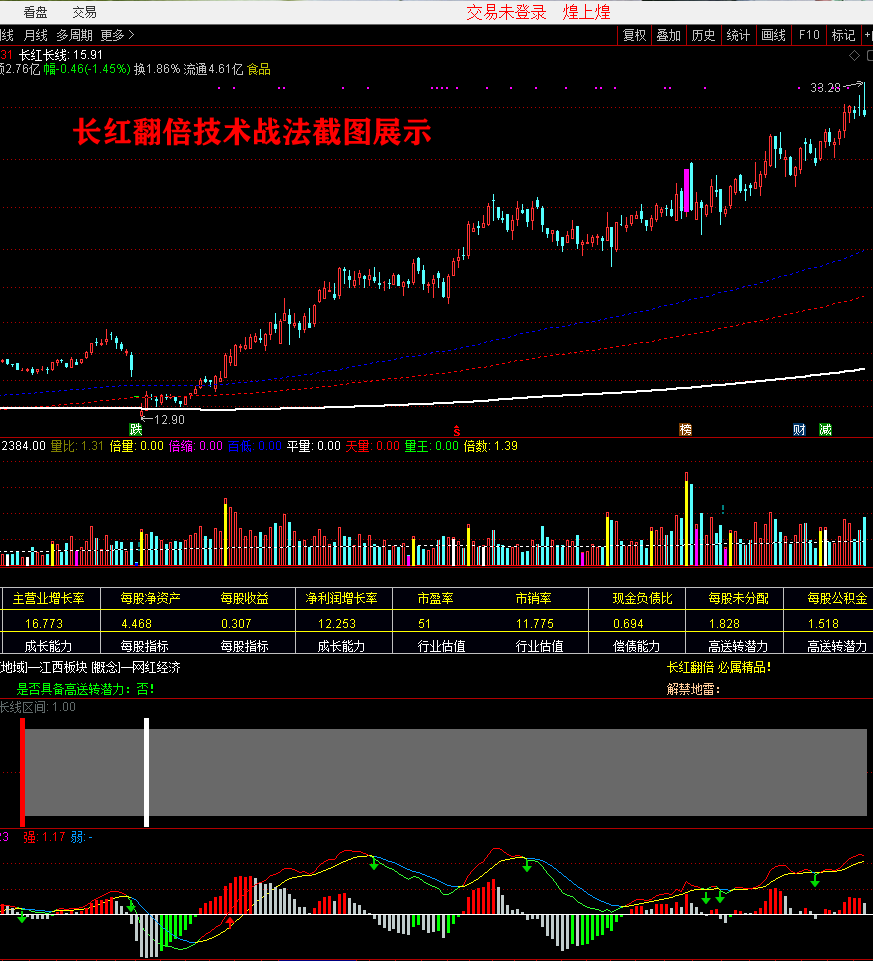 3、4副图介绍:其中的长红长线副图是长红长线翻倍交易系统核心指标之二,主要用于提示长线买点、回踩和最后的卖点;长红翻倍技术战法量能看成交量情况;长红翻倍技术战法MACD看中长线趋势;长红翻倍技术战法财务副图看该股最基础的财务数据。最主要是依据长线副图的买点作为决策参考,其它三个副图可看可不看。