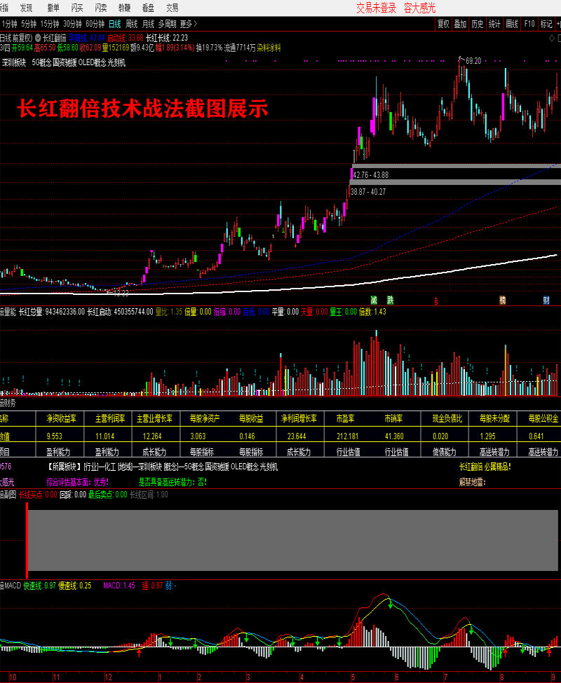 1、长红翻倍技术战法交易系统由1主图4副图组成:1主图为长红翻倍技术战法主图,4副图为长红翻倍技术战法量能、长红翻倍技术战法MACD、长红翻倍技术战法副图和长红翻倍技术战法财务副图。