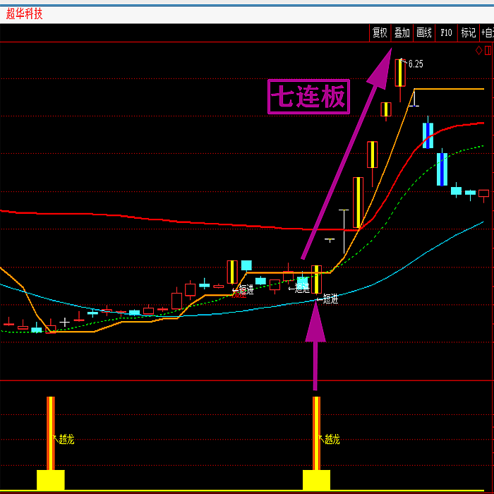 6、信号出现时的前一天如果是涨停板的,信号当天尽快不去追高买入,如果形态好的可以在次日看情况做低吸。
