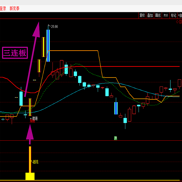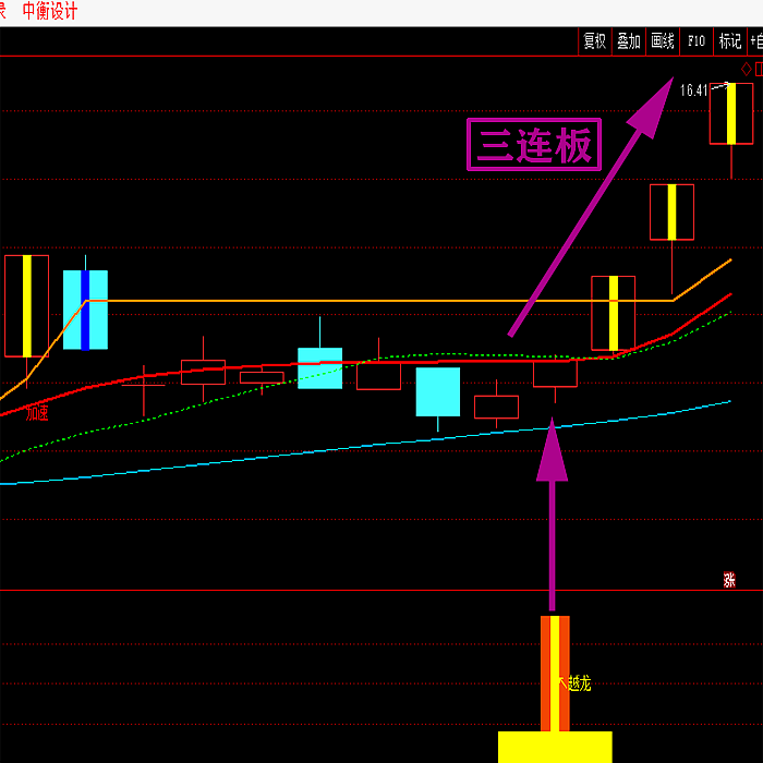 3、信号出现时K线穿多均线,上方均线越少表明压力就越小,爆发力就越大。