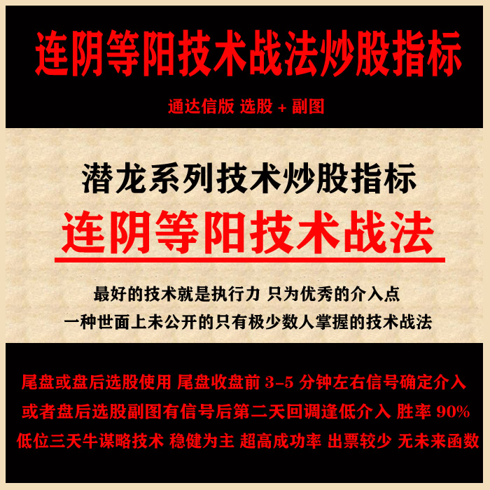 潜龙系列技术 通达信版连阴等阳技术战法炒股指标 选股+副图 一种世面上未公开的只有极少数人掌握的技术战法 低位三天牛谋略技术 稳健为主 超高成功率连阴等阳技术战法炒股指标用法: